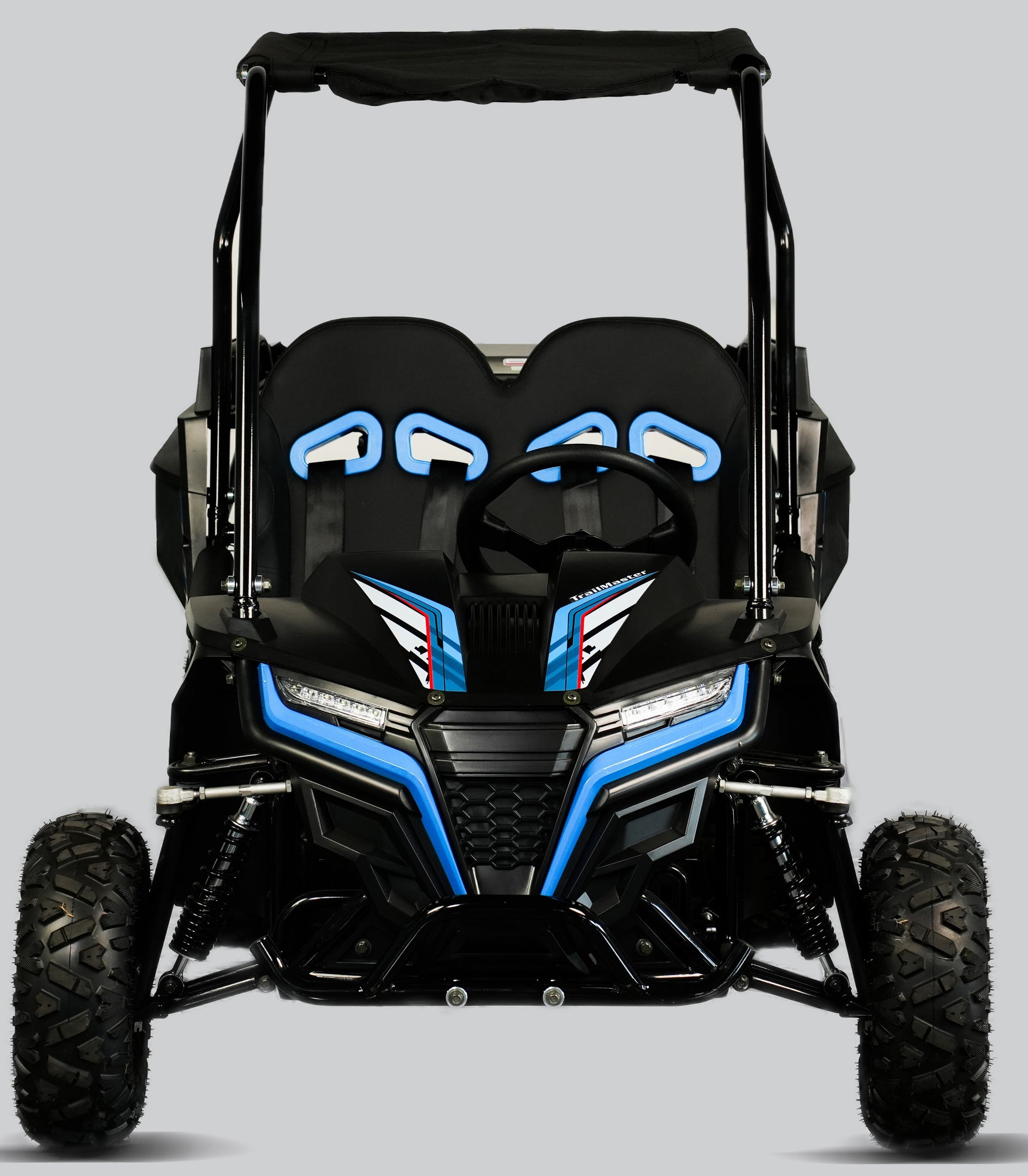 The Cheetah 6 boasts a 163cc, 5.5 HP horizontal OHV Engine and a torque converter CVT transmission, enabling a smooth takeoff. It can achieve a top speed of up to 24 MPH. The seat is adjustable, with a pedal-to-seat back range of 28” to 32”. For ease of starting in cold temperatures, it features a manual choke. Safety is enhanced with a pull cord kill switch. It also comes with an automatic CVT with reverse, hydraulic disc brake, 4-point safety seat belts, parking brake, fenders, a canopy top, and a cargo rack. The striking body panels and LED headlight package make the Cheetah 6 an impressive vehicle.