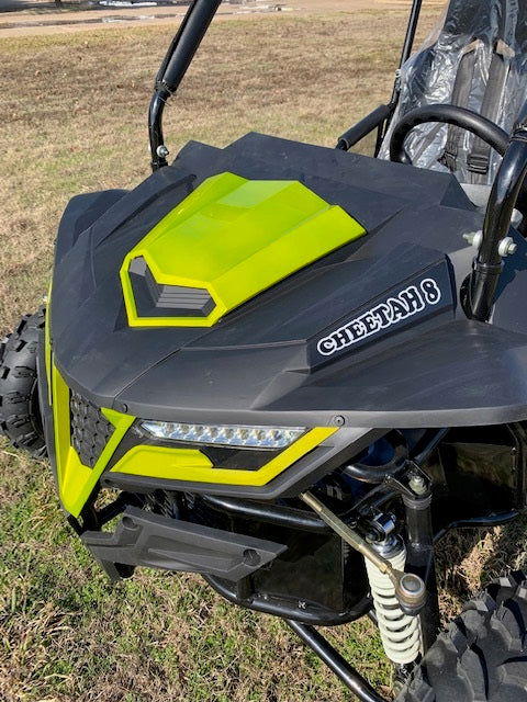 True to its namesake, the Cheetah is sleek, powerful, fast and agile with the power plant, drivetrain, suspension of a high-performance go-kart and the functionality of a utility vehicle. Extra-long, independent front swing arms, a double ball joint, articulating rear suspension and ample ground clearance lets you glide over the roughest terrain and performing like independent suspension making it much harder to flip over. Adjustable high back bucket seats, and adjustable steering wheel will accommodate all shapes, sizes and skill level of the wild animal tamers in your family.
