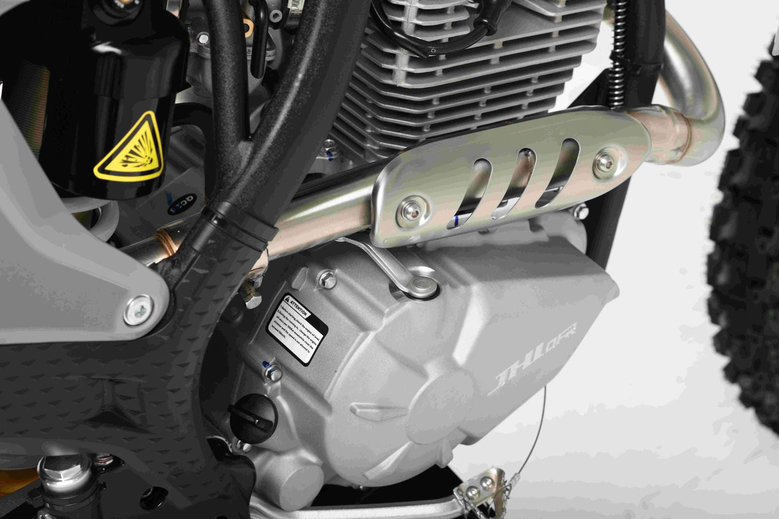 The LX250 by TrailMaster, in partnership with JHL Offroad, is an advanced and expertly designed mid-size dirt bike. With a Zhongshen 249cc 4-stroke 14hp engine, it boasts a durable and powerful ride. Offering a seat height of 37.4" and a weight of only 266lbs, it is both comfortable and lightweight. Equipped with both a kick start and "ELECTRIC START", this bike is incredibly reliable. It comes in red and blue colors, and features a 6-speed manual transmission, as well as front and rear disc brakes and an inverted front shock.