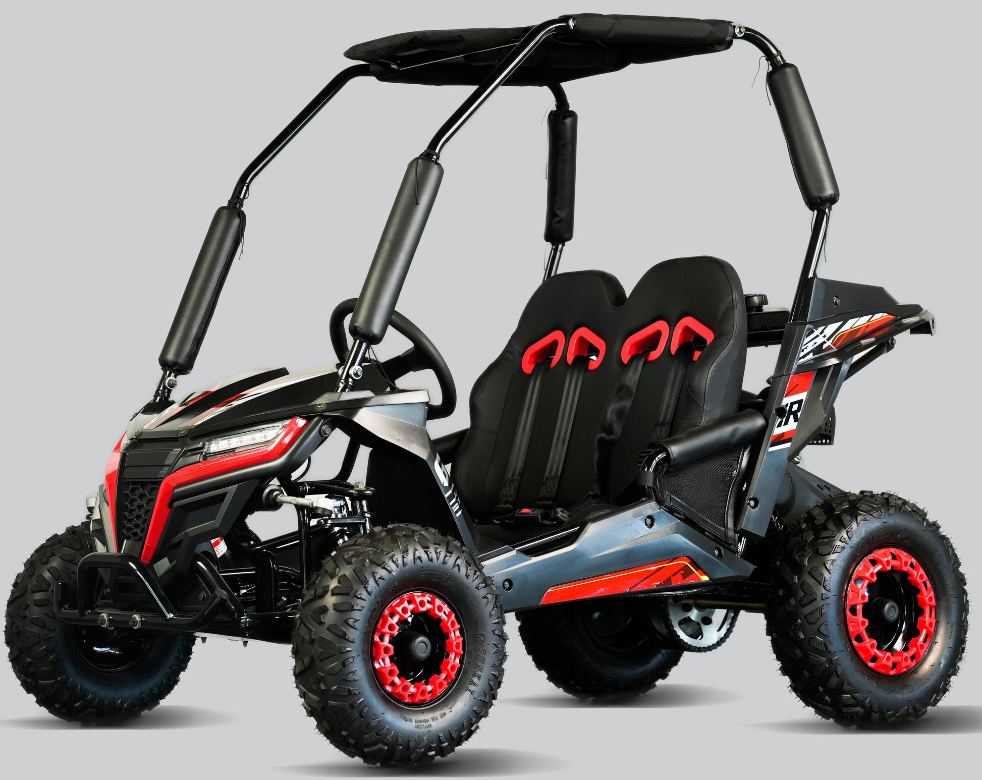 The Cheetah 6 boasts a 163cc, 5.5 HP horizontal OHV Engine and a torque converter CVT transmission, enabling a smooth takeoff. It can achieve a top speed of up to 24 MPH. The seat is adjustable, with a pedal-to-seat back range of 28” to 32”. For ease of starting in cold temperatures, it features a manual choke. Safety is enhanced with a pull cord kill switch. It also comes with an automatic CVT with reverse, hydraulic disc brake, 4-point safety seat belts, parking brake, fenders, a canopy top, and a cargo rack. The striking body panels and LED headlight package make the Cheetah 6 an impressive vehicle.