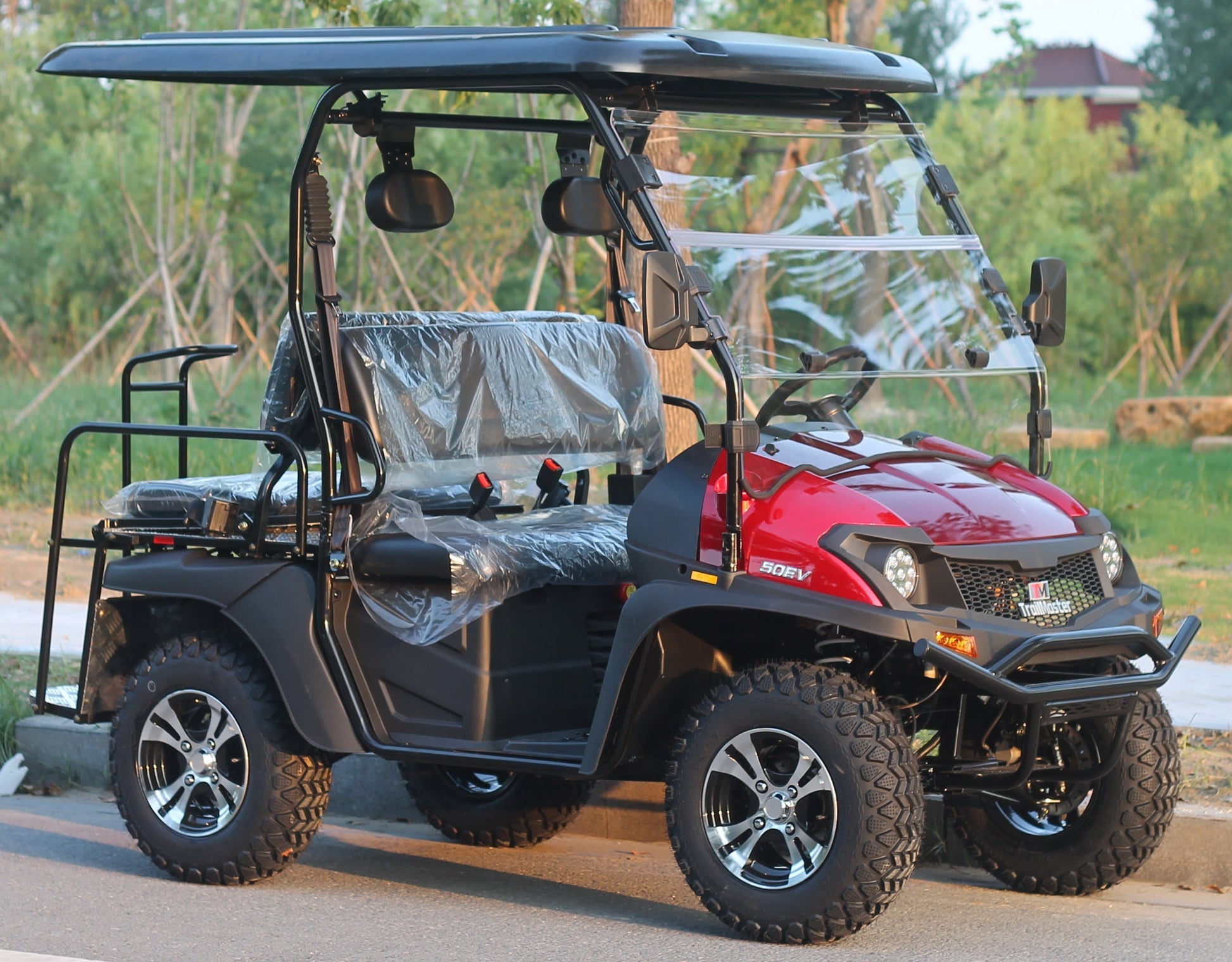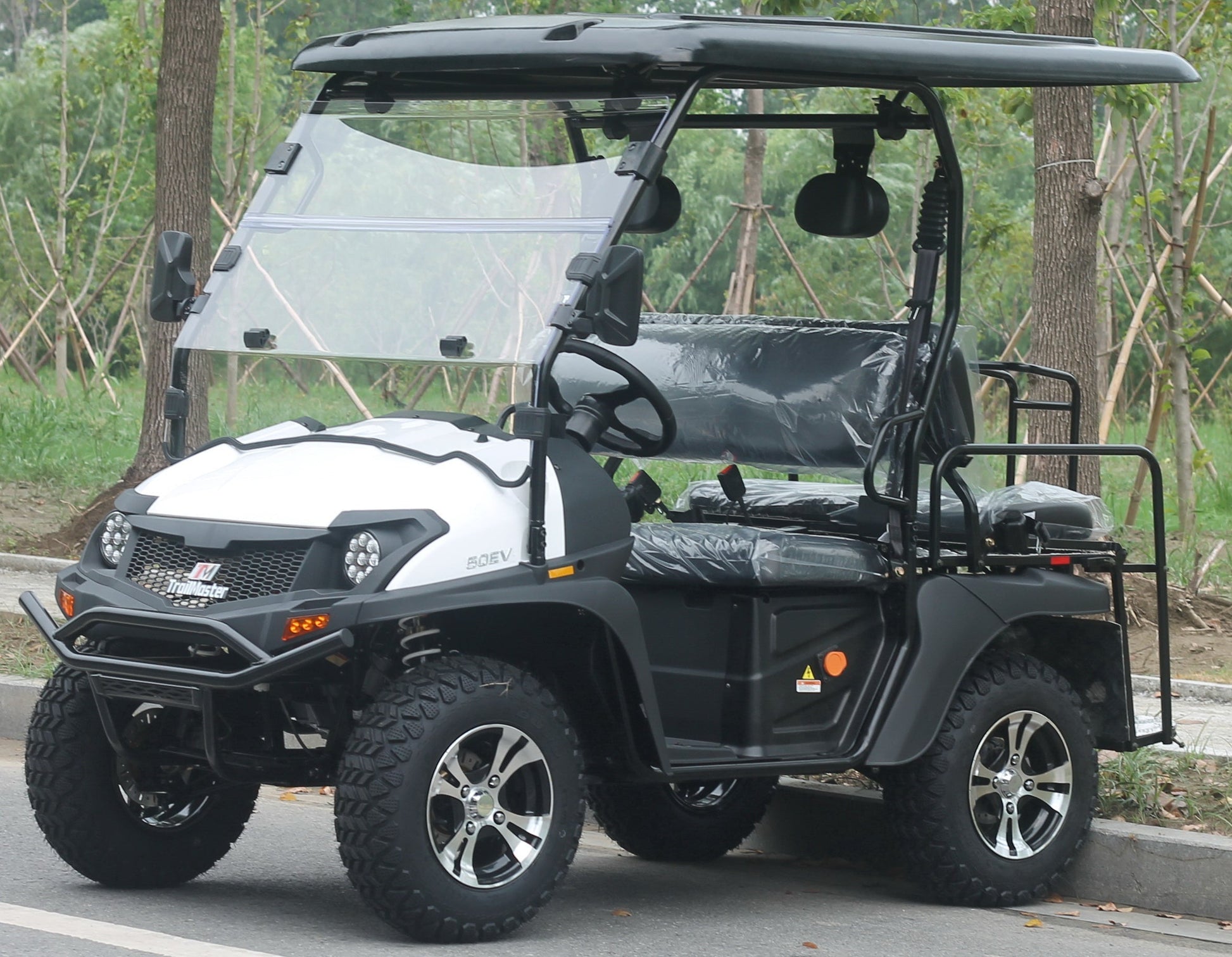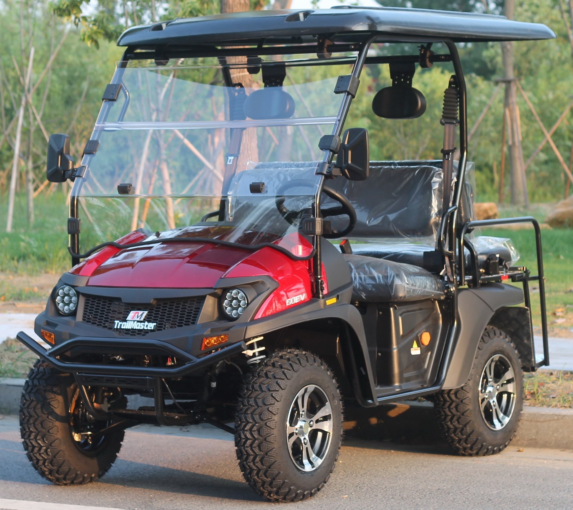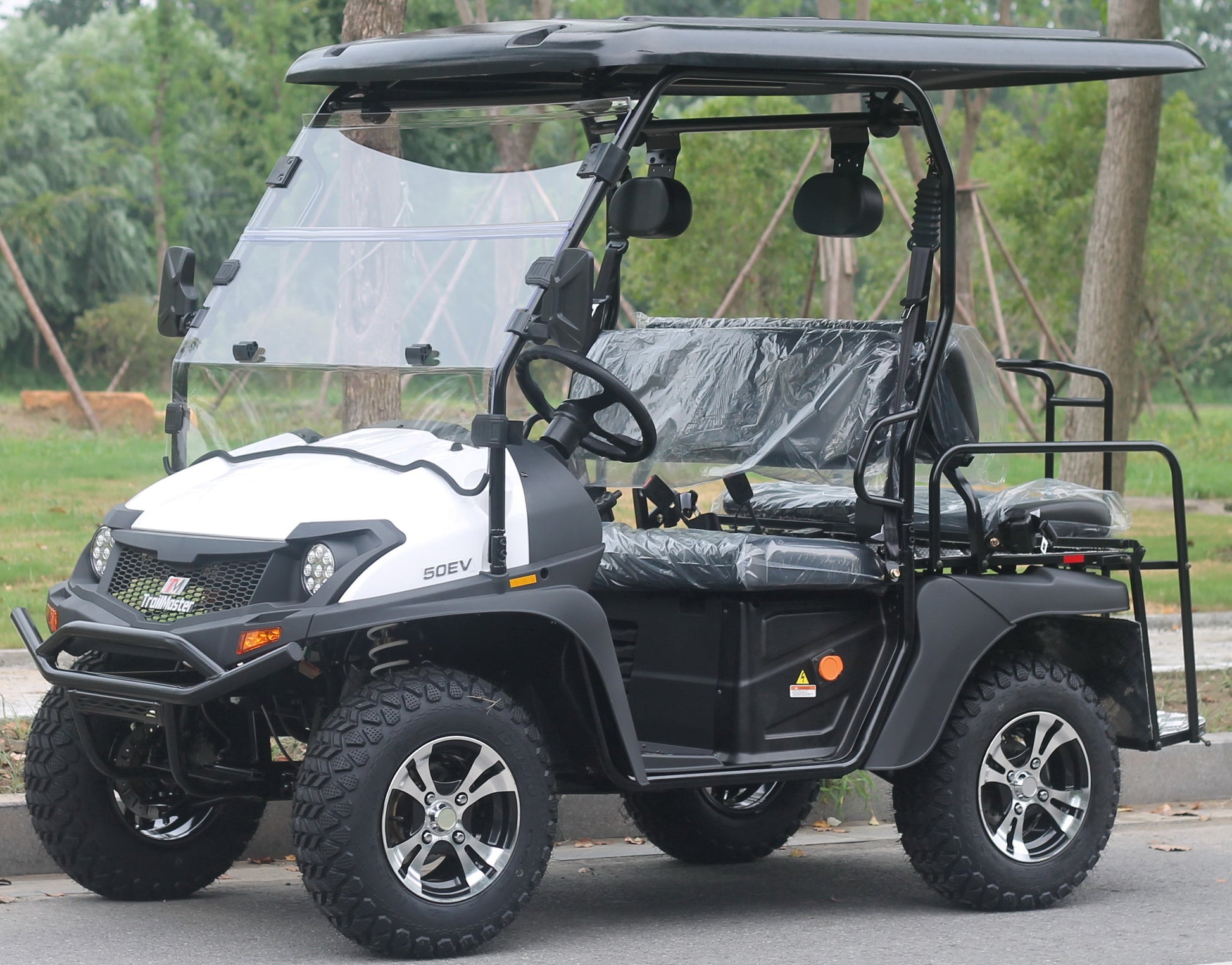 The Taurus 50EV is a an electric edition of the TrailMaster popular utility side by side. It has a 60V BLDC Brushless DC motor with 5kw of power and has a 48 mile estimated range. Other notable features includes: aluminum wheels package, large and aggressive front and rear 25 x 8-12 / 25 x 10-12 off-road tires, Hi/Lo LED headlights, turn signals, rearview side mirrors, digital dashboard, hard top, steel front bumper, retractable safety seatbelt, 12 volt outlet, and cup holder.
