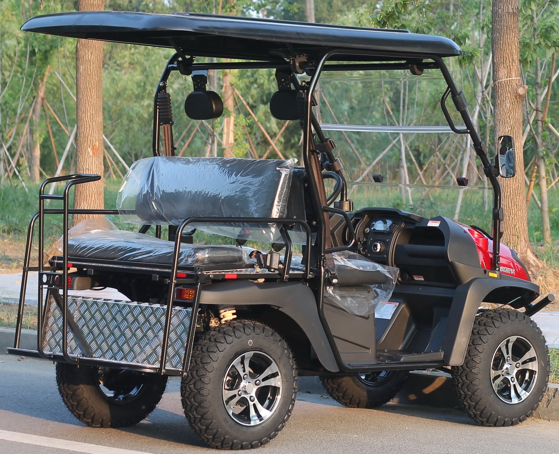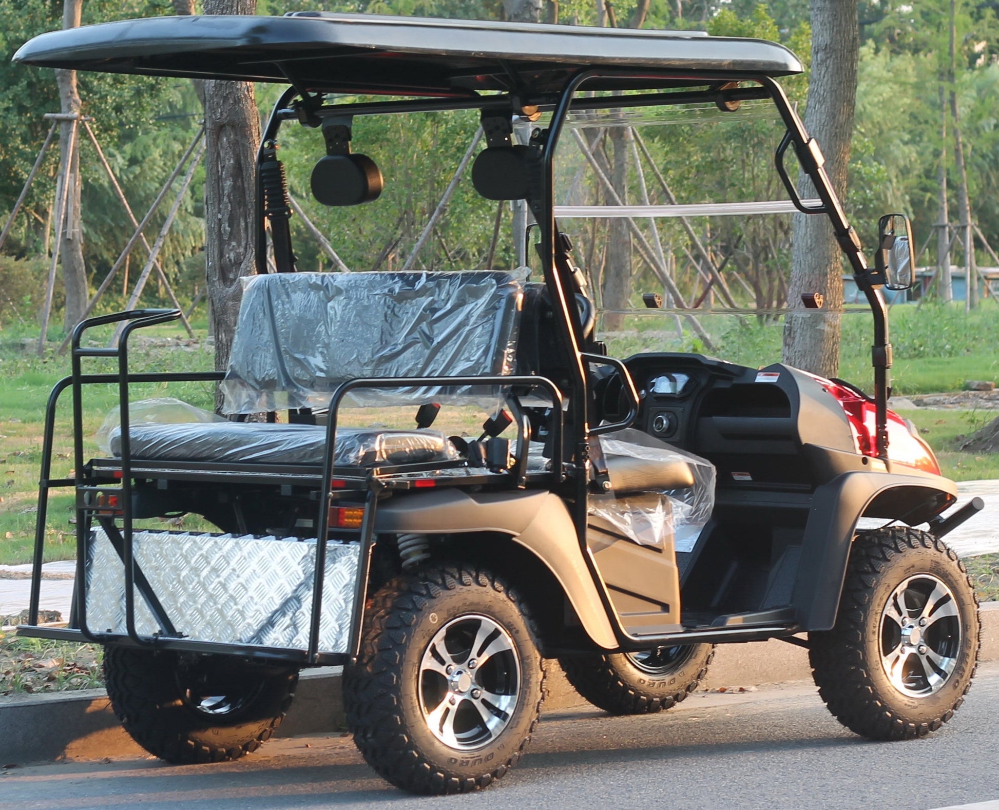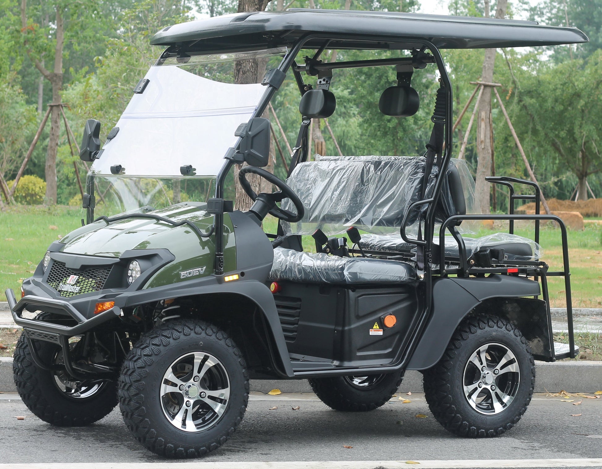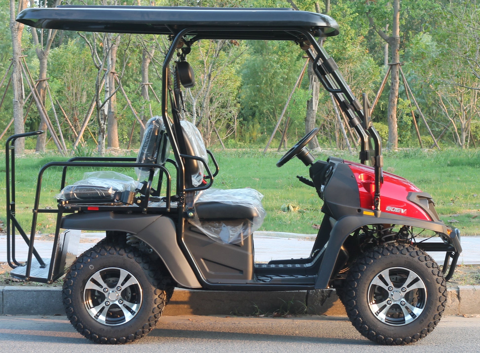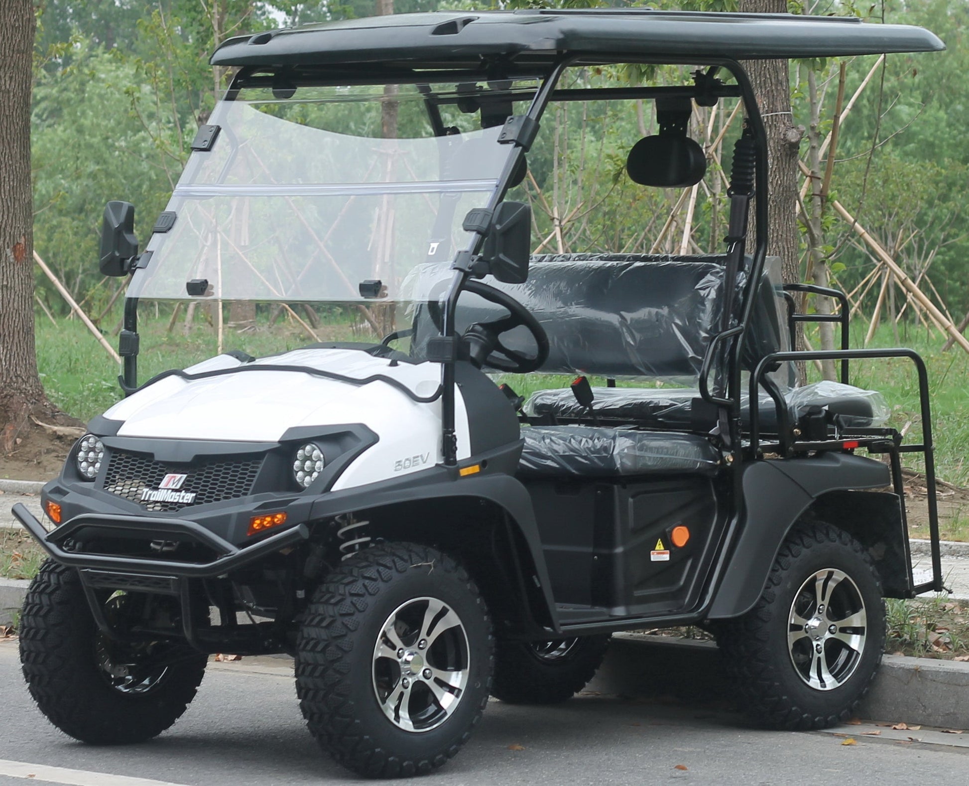 The Taurus 50EV is a an electric edition of the TrailMaster popular utility side by side. It has a 60V BLDC Brushless DC motor with 5kw of power and has a 48 mile estimated range. Other notable features includes: aluminum wheels package, large and aggressive front and rear 25 x 8-12 / 25 x 10-12 off-road tires, Hi/Lo LED headlights, turn signals, rearview side mirrors, digital dashboard, hard top, steel front bumper, retractable safety seatbelt, 12 volt outlet, and cup holder.